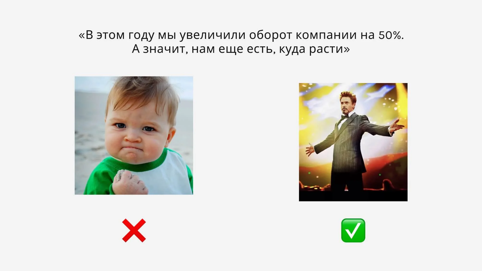Конкретная картинка может выполнять сразу несколько задач. Например, цепляющая фотография с необычным ракурсом сначала удивляет, но затем демонстрирует мысль спикера. А знакомый мем в начале выступления снимает напряжение и готовит зрителя к сложной для восприятия информации.