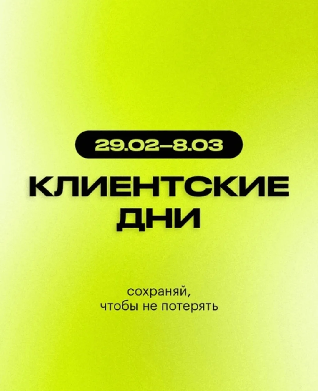 Но если нужно донести чуть больше информации, появляется необходимость в визуальной иерархии — чтобы у текста появилась главная и второстепенная часть. В следующей картинке к посту с анонсом клиентских дней для даты и основной информации используется привлекающий внимание жирный шрифт. А для дополнительной надписи внизу — более простой, чтобы она не отвлекала внимание от главного.