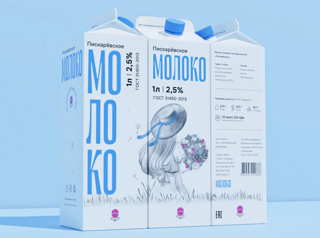 Часто два шрифта используют в упаковках, там нужно структурировать много информации: название бренда, название самого продукта, его характеристики. В этой упаковке молока акцент сделан на названии продукта, оно выделено крупным необычным шрифтом. А название бренда «Пискарёвское» отходит на второй план.