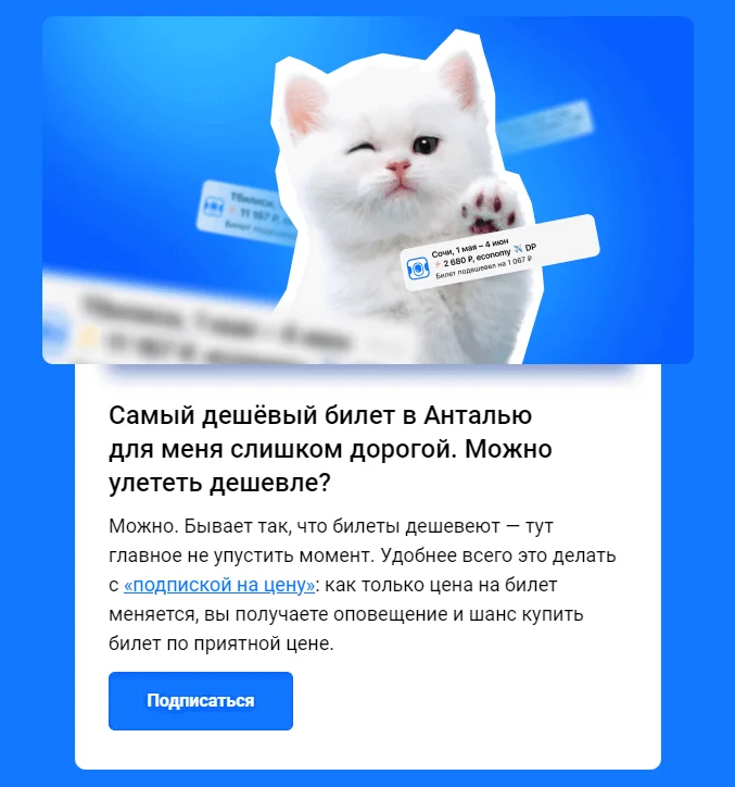 Посмотрим на рассылку Aviasales: для заголовка взят более жирный шрифт, для основного текста — более тонкий, и это уже шрифтовая пара.