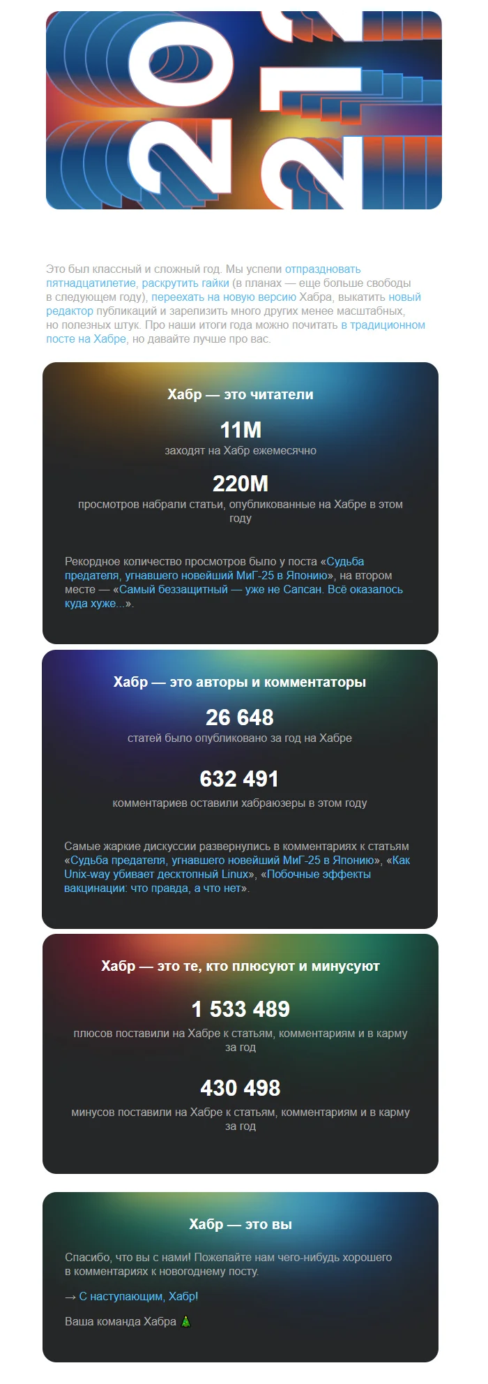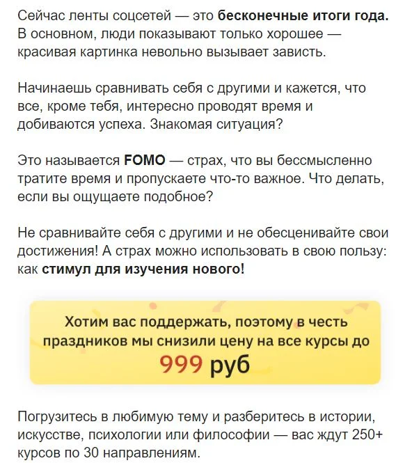 Соберите в последнем письме лучший контент, который вы написали за год. Расскажите о самых успешных и интересных мероприятиях и их итогах.