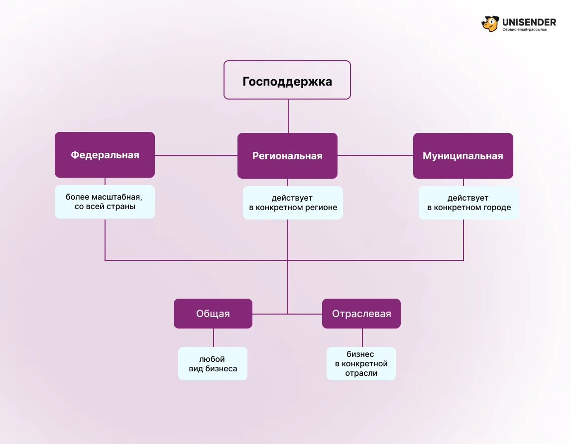 Можно выделить такие группы мер господдержки: федеральные, региональные и муниципальные. Все они делятся на общие и отраслевые.