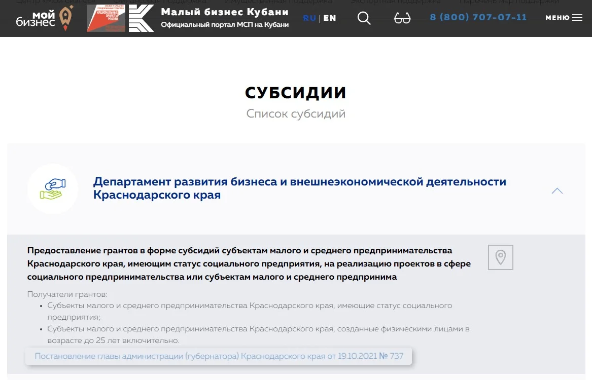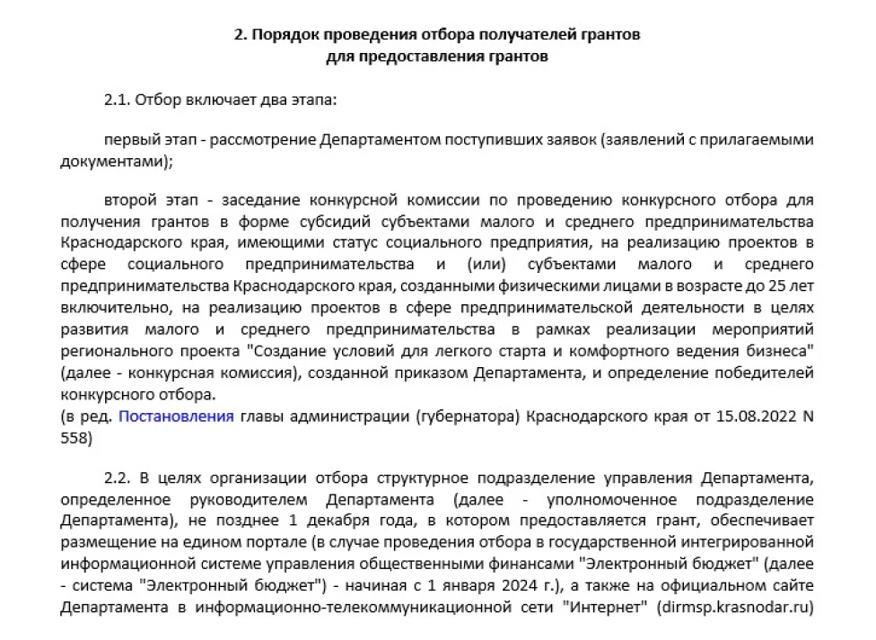Поисковые системы. Можно вбить запрос в Google или Яндекс, чтобы найти нужную программу. Например, ищем гранты на открытие бизнеса в Краснодарском крае. Находим официальный сайт и нормативно-правовой акт, в котором указана вся информация для участия.