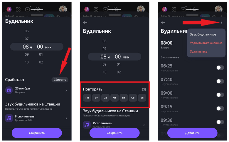 Алиса умеет включать будильник один раз и по расписанию, например, каждый день в 8 утра. Звук будильника тоже можно настроить, но уже через саму колонку с помощью голосовой команды. А если нажмете на три точки в верхнем правом углу, сможете изменить громкость звука будильника, удалить только выключенные или все будильники.