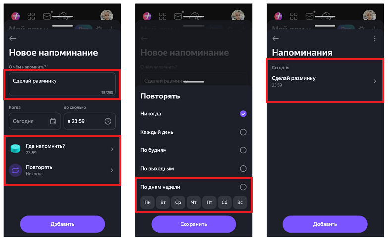 Еще одна полезная функция колонки Алиса — напоминания. Когда включите и настроите ее, Алиса будет напоминать о важных событиях и делах, например, позвонить близким или сходить в магазин. Для напоминаний тоже можно задать расписание, а также способ оповещения: голосом через колонку или в виде пуш-уведомления в телефоне.