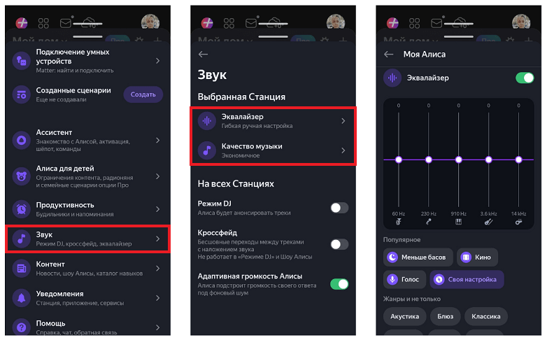 Чтобы колонка Алиса звучала лучше, перейдите в раздел «Звук». Здесь можно настроить эквалайзер, повысить качество музыки, включить бесшовный переход между треками (кроссфейд), режим DJ и адаптивную громкость.