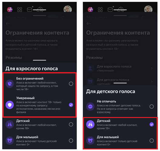 Если у вас есть дети, настройте на колонке Алиса «родительский контроль». Перейдите в раздел «Алиса для детей» и нажмите на «Ограничение контента». Здесь можно настроить режимы для детского и взрослого голосов.