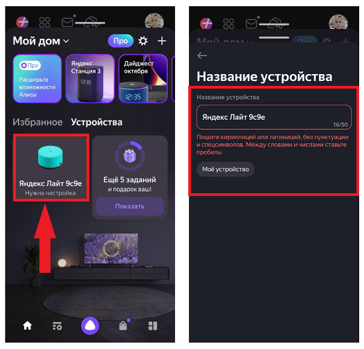 Настроить колонку Алиса от и до можно прямо в приложении. Для начала перейдите в раздел «Устройства» и нажмите на название станции с подписью «Нужна настройка». Дайте своей колонке новое имя и сохраните настройки.