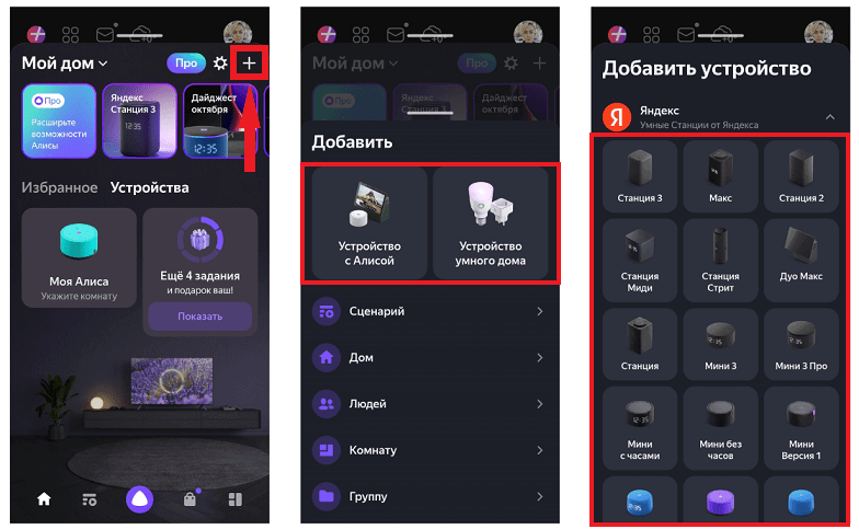 В приложении Яндекс вы можете добавить и настроить сразу несколько колонок Алиса, а также устройства умного дома. Для этого нажмите на иконку с изображением плюса, выберите тип устройства — «Устройство с Алисой» или «Устройство умного дома», — а затем найдите нужный девайс в списке и следуйте инструкциям.