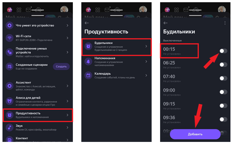 Чтобы настроить будильник на колонке Алиса в приложении, кликните по названию устройства, нажмите на раздел «Продуктивность» и выберите в списке «Будильники». Задайте время, передвиньте бегунок вправо и нажмите на кнопку «Добавить».