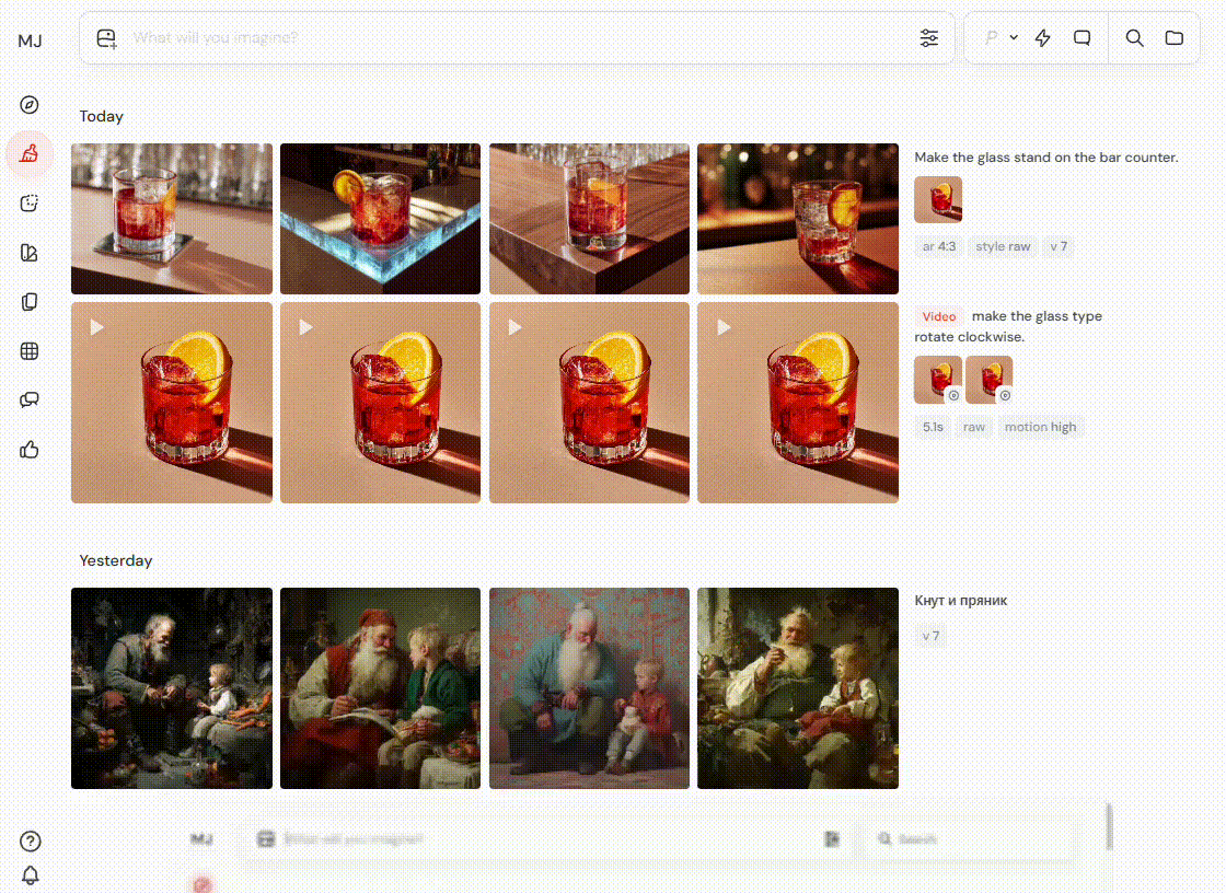 Image Prompts. Функция заимствует содержимое референса: объекты, персонажей, композицию. Midjourney анализирует загруженное изображение и старается включить его ключевые элементы в новую генерацию. Можно загрузить фотографию товара и с помощью текстового промпта поместить его в любое окружение. Например, дать задачу нейросети сгенерировать изображение, на котором стакан с коктейлем будет стоять на стойке бара.