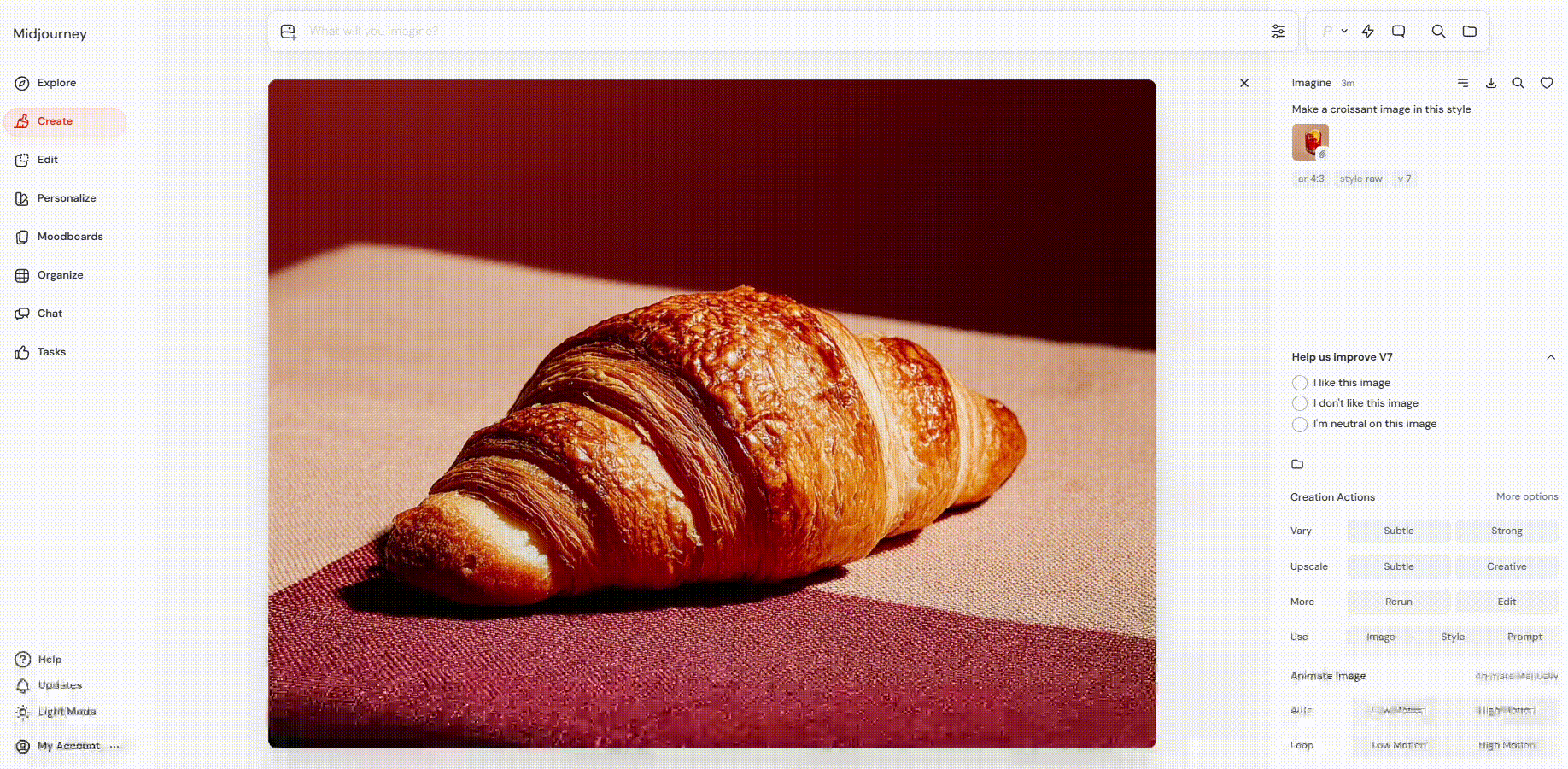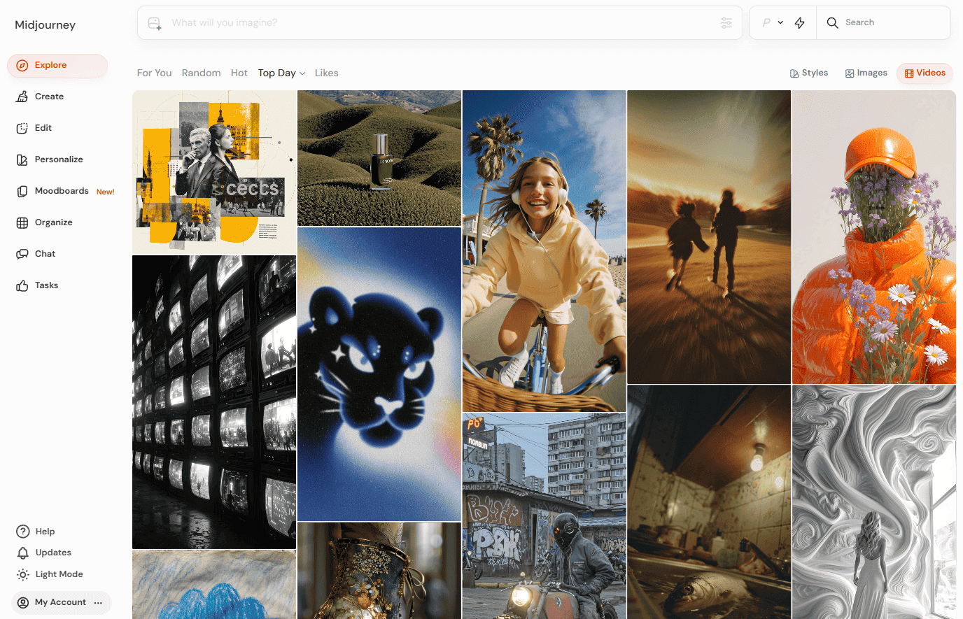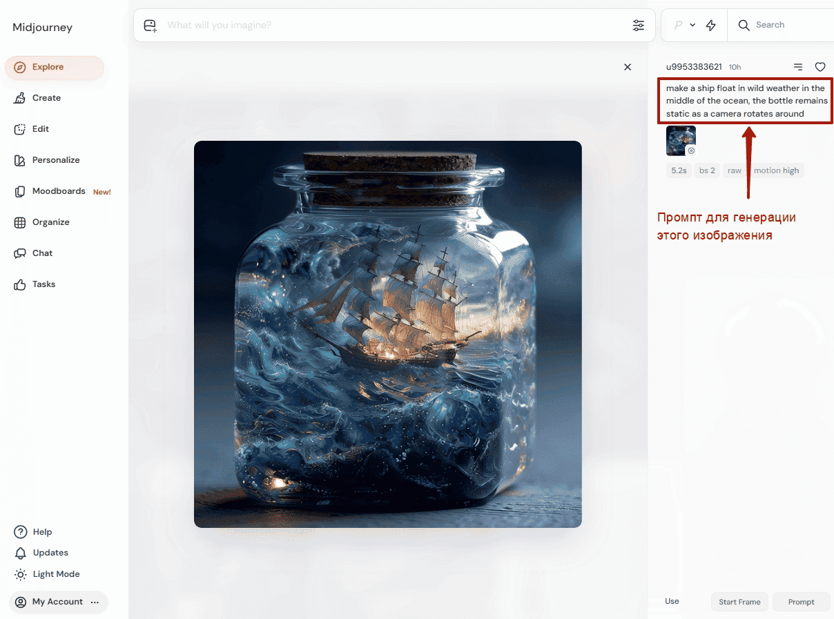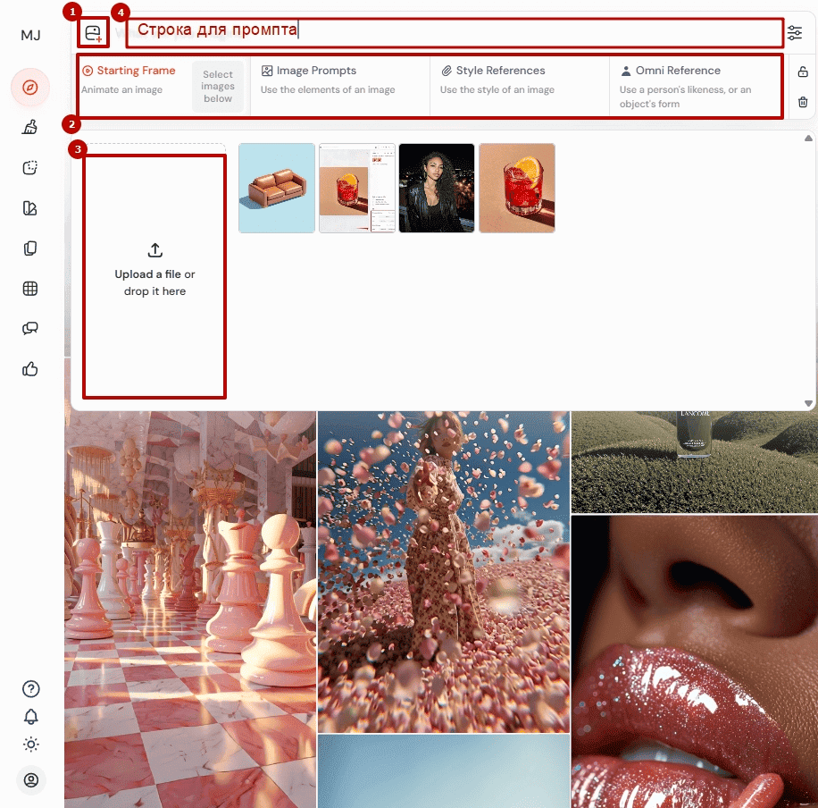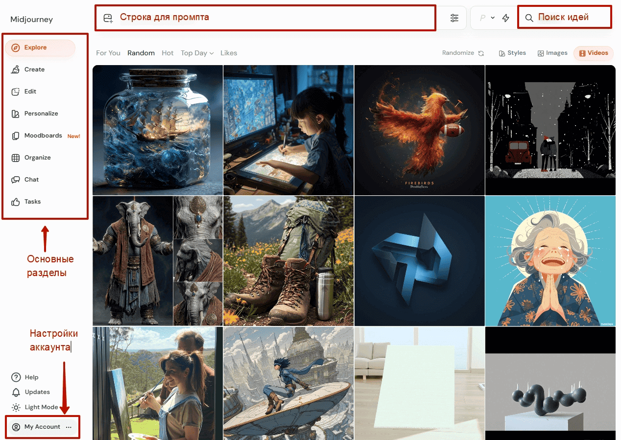 Работать можно через веб-версию или Discord. Основной инструмент — строка ввода промпта, к которому можно добавлять изображения-референсы для точной стилизации. Функционал включает генерацию картинок и коротких видео, редактирование изображений по выделенной области, настройку персонального стиля и создание мудбордов.