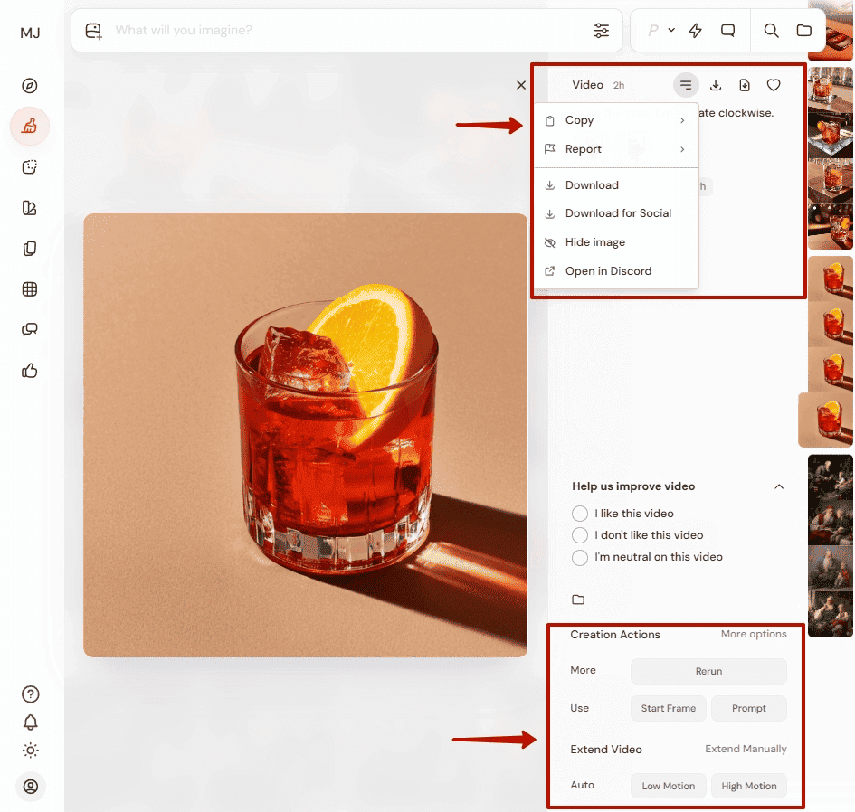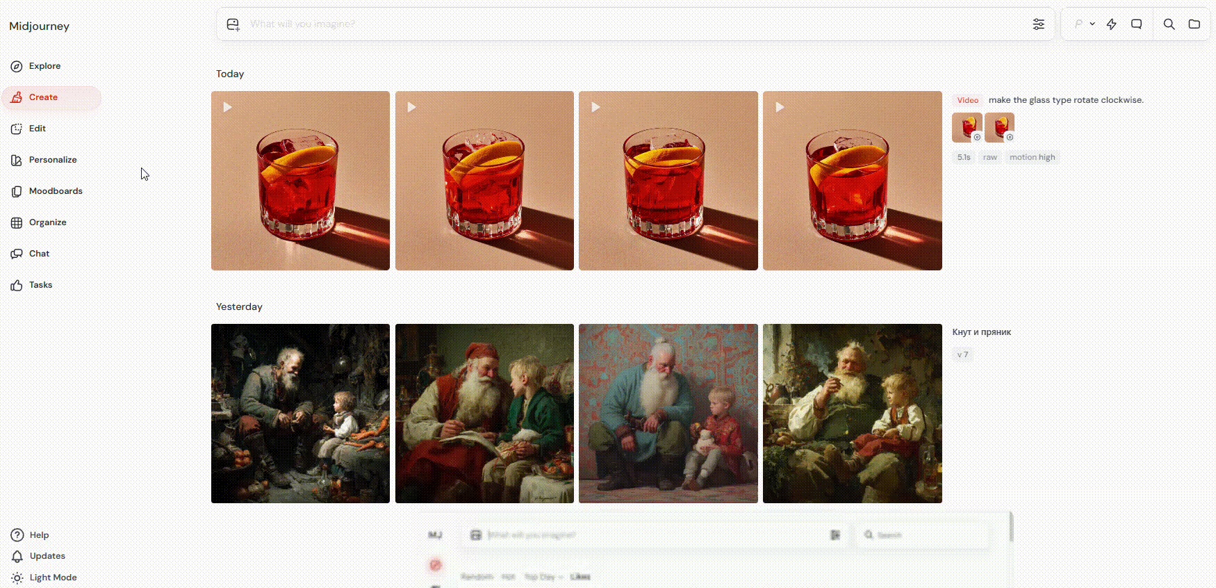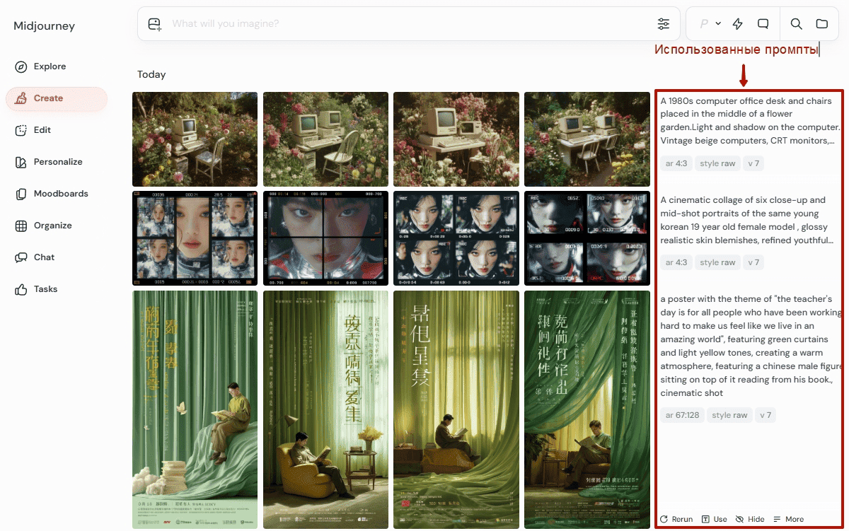 Здесь хранятся все изображения, сгенерированные пользователем совместно с нейросетью. В отличие от Discord, где изображения собраны в ленту, здесь контент организован в виде сетки. В этом разделе можно найти прошлую генерацию, сделать ее вариации или скопировать промпт.