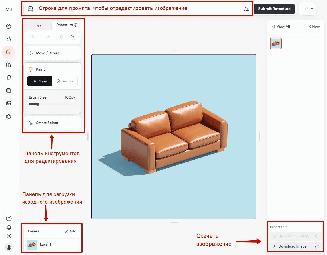 В этом разделе можно доработать любые изображения, загруженные с компьютера или по ссылке. С помощью инструментов «Smart Select» для автоматического выделения объектов и «Paint» для ручной маскировки, можно указать конкретную область для изменения. В режиме Edit эту область можно изменить по текстовому промпту — например, добавить объект. А с помощью функции Retexture можно поменять материал или текстуру предмета на изображении.