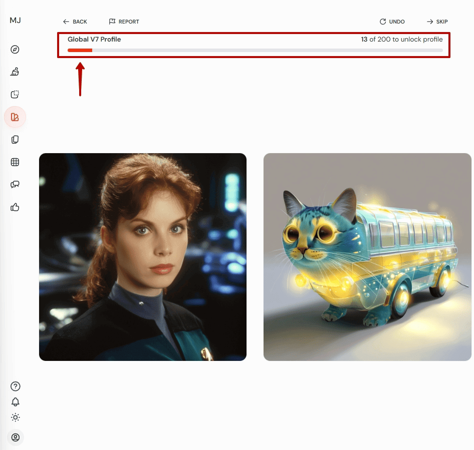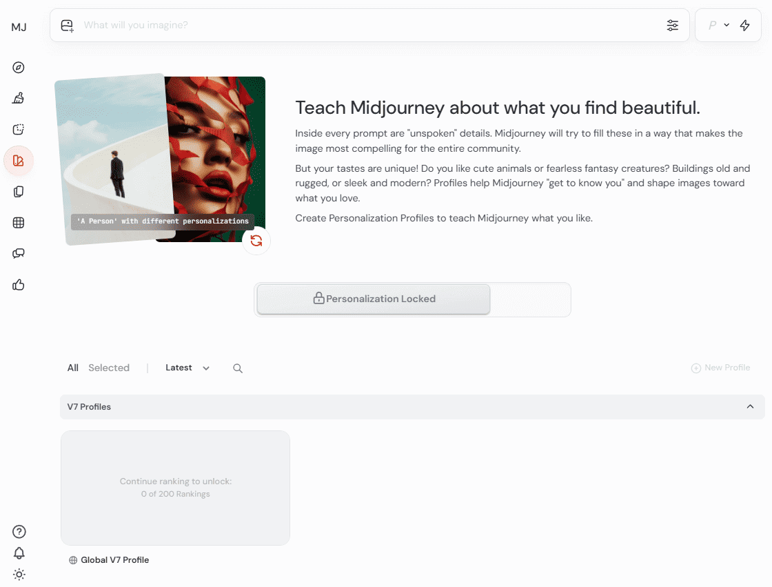В этом разделе можно «обучить» нейросеть персональному стилю. Для этого нужно создать мудборд либо «Глобальный профиль» и оценить 200 пар изображений, которые представит Midjourney. На основе этого нейросеть настроит предпочтения по контенту.