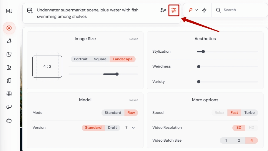 Для детализации запроса в строке промпта есть кнопка с тремя ползунками. Она открывает панель настроек, которые позволяют выбрать соотношение сторон, модель нейросети, стилизацию и другие параметры перед запуском генерации.