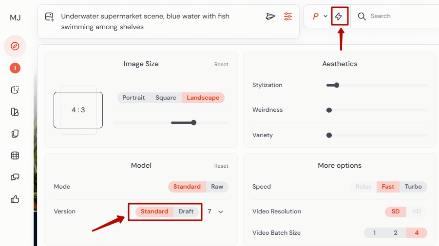 Параметр Standard генерирует изображения в максимальном качестве. Режим Draft работает быстрее, но создает черновики с пониженной детализацией — это подходит для быстрого перебора и тестирования идей.