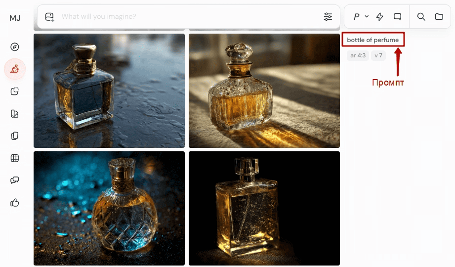 На сайте Midjourney находится полноценная рабочая студия, где можно создавать изображения, управлять проектами и искать вдохновение. Главный инструмент находится в верхней части экрана — это строка для ввода промпта.