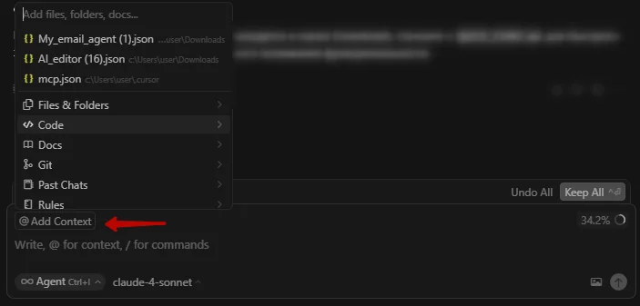 Также прикрепить какой-то файл к контексту можно с помощью «@» в чате.