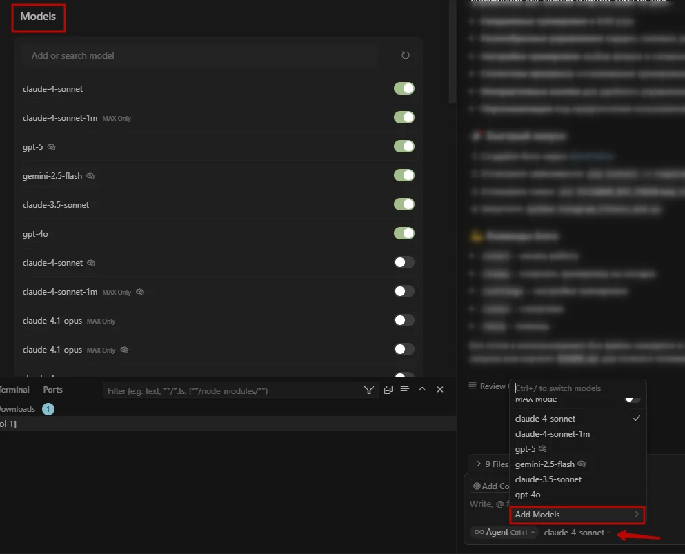 В окне для чата с нейросетями можно выбирать режимы работы: Agent или Ask. Здесь нужно давать нейронкам задания, выбирать модели для ответов, добавлять дополнительный контекст и создавать новые чаты. Для работы доступны все популярные модели от ChatGPT, Claude и Gemini. Также можно подключить Grok, Kimi и DeepSeek. Для этого в переключателе моделей нужно выбрать Add models и в открывшемся окне отметить чекбоксы напротив нужных нейросетей.