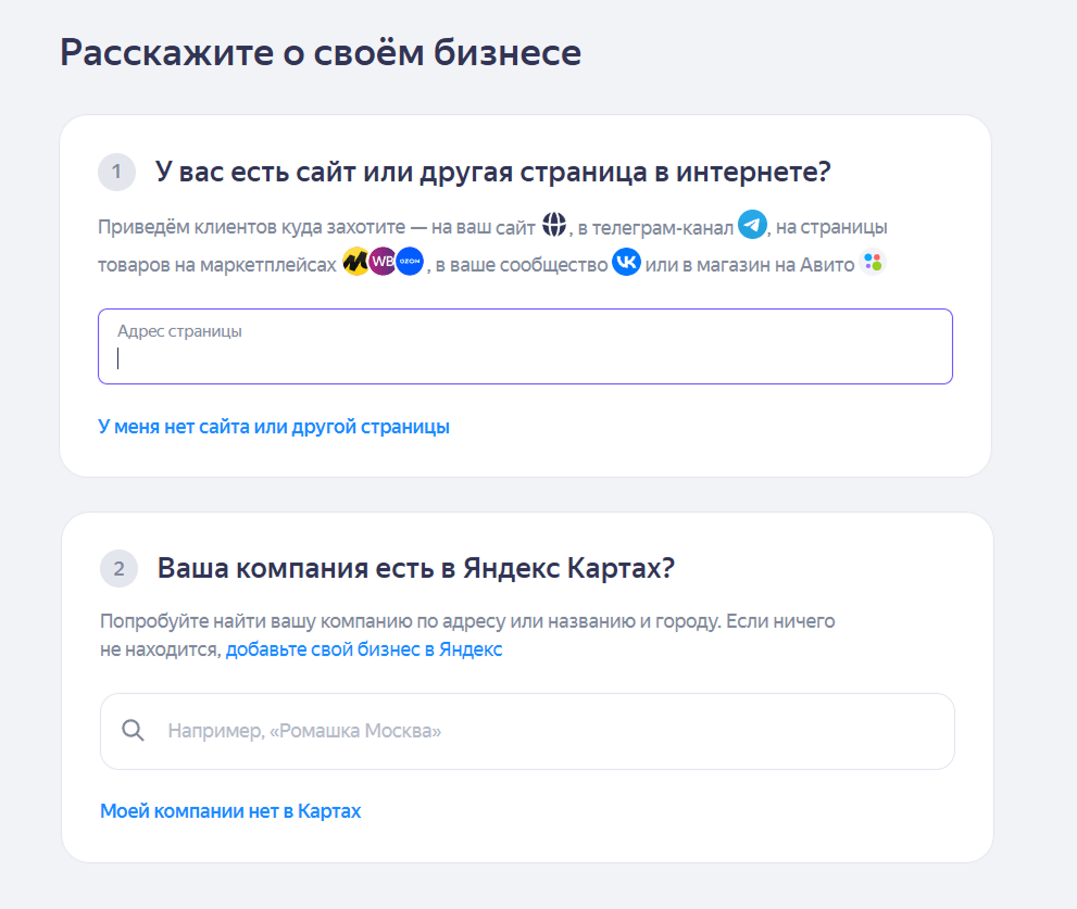 Если у вас нет своего сайта, в личном кабинете можно взять готовый от Яндекс Бизнеса. Это простая и удобная страница, которая уже настроена для рекламы.