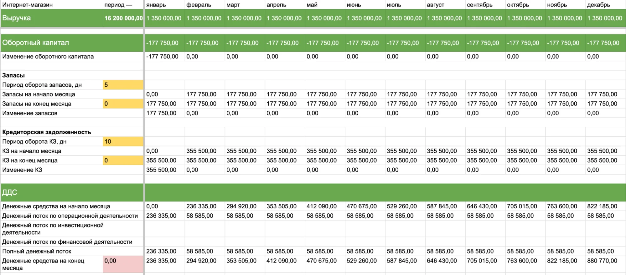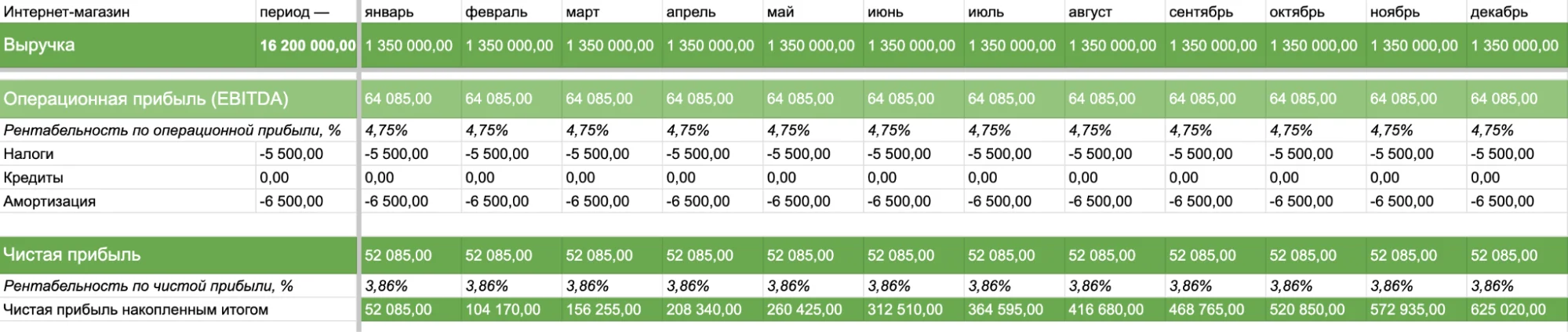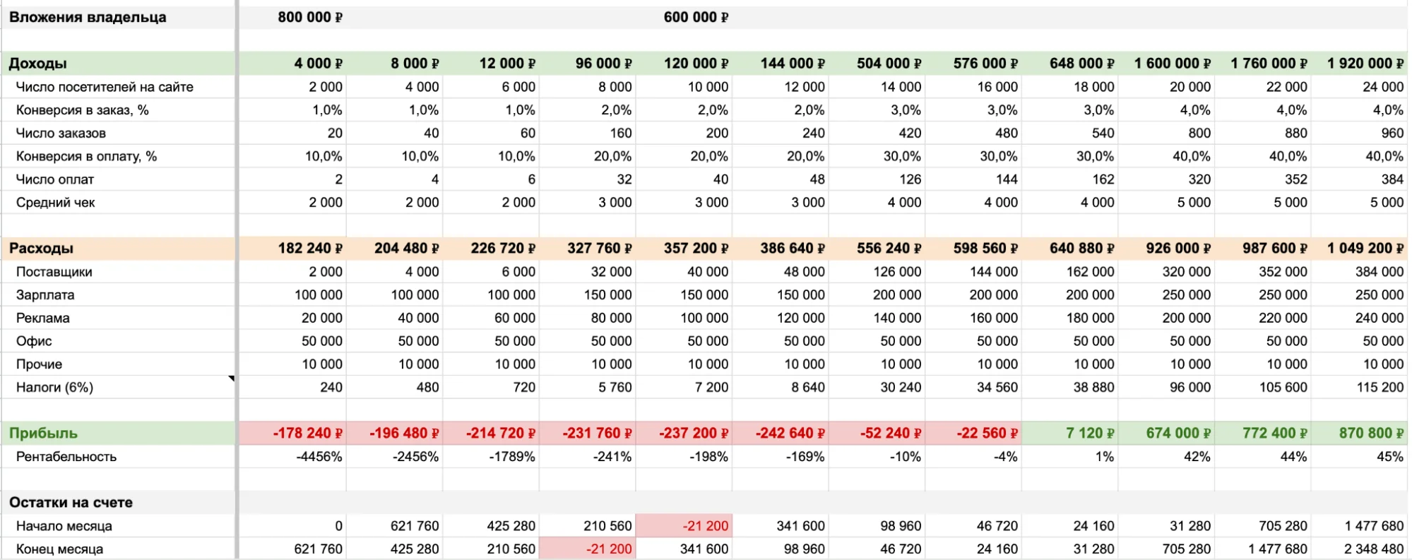 Себестоимость и расходы. Закупочная цена товаров, логистика и растаможка, НДС, доставка до склада, складские расходы, упаковка и промо-материалы. Отдельно — фонд оплаты труда с указанием окладов, схем мотивации и налогов, комиссии (если, например, продаете на Wildberries или Flowwow), реклама, аренда, связь и другие административные расходы.