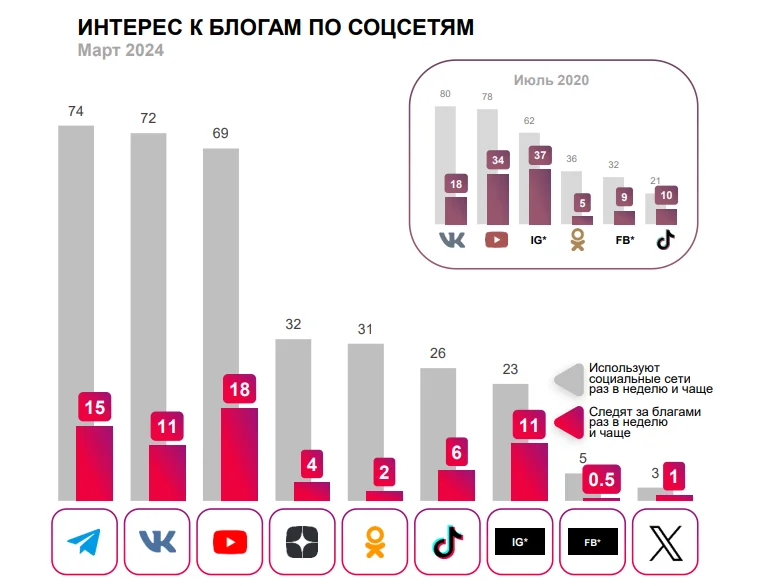 Несмотря на блокировку соцсети в РФ, Instagram* и в 2025 году остается лидирующей площадкой, на которой пользователи следят за блогерами и взаимодействуют с контентом. Это видно даже в зарубежных исследованиях, где проводился анализ отличительных особенностей потребления контента россиянами.