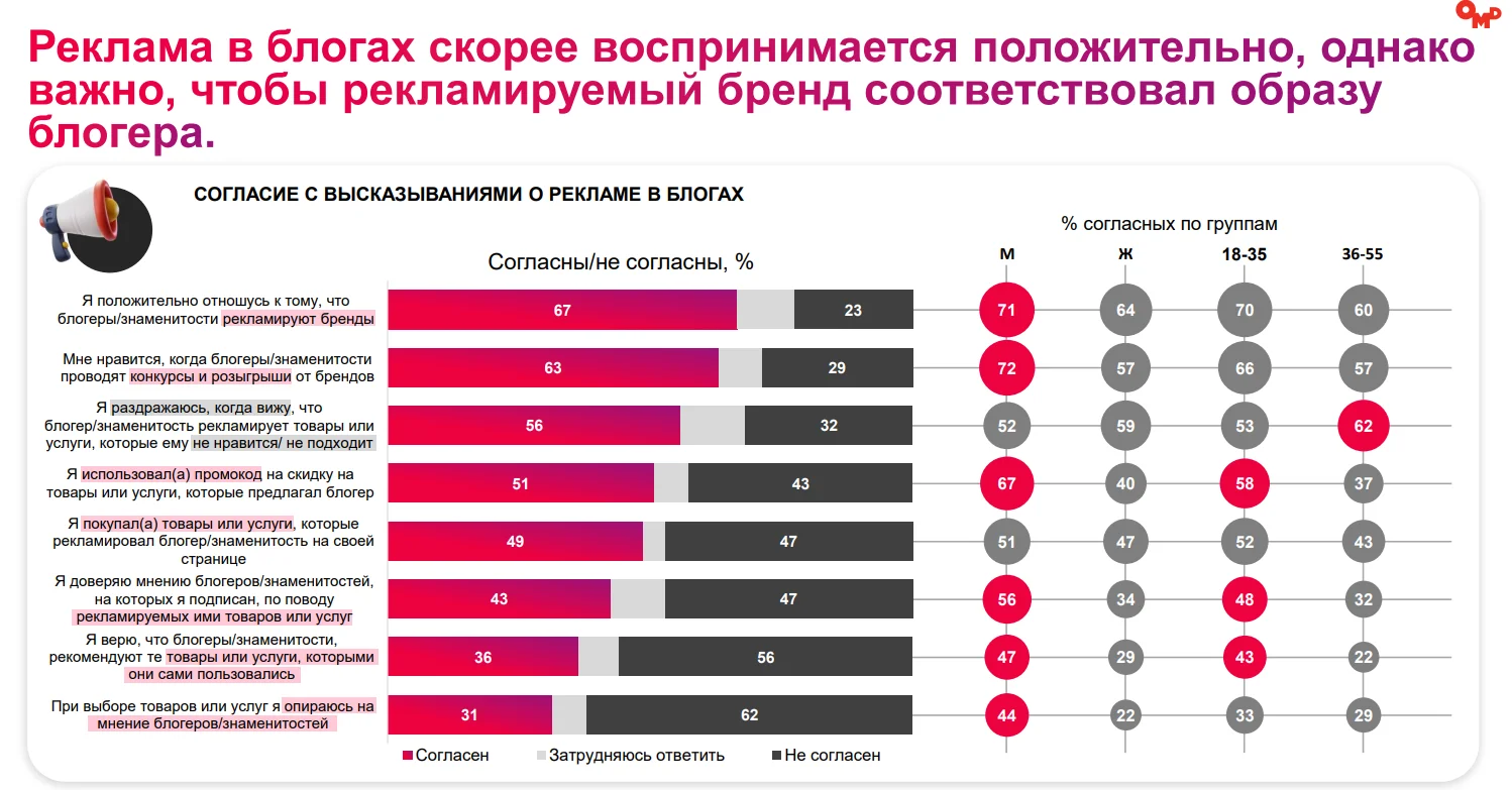 Сохраняется интерес к товарам в блогах. Люди продолжают покупать рекламируемые блогерами товары, тенденций к сокращению покупок не наблюдается. Рекламные посевы хорошо работают, 51% опрошенных использует промокоды от блогеров.