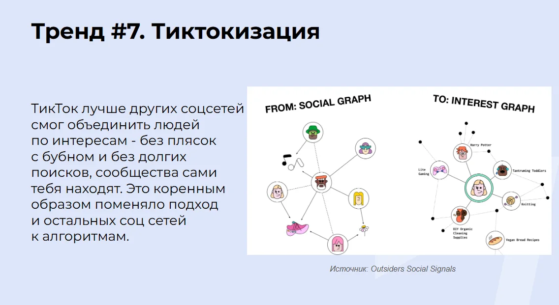 Ключевые тренды — смещение акцента с публичного на личное взаимодействие: репосты в личные сообщения, индивидуальная интерпретация контента.