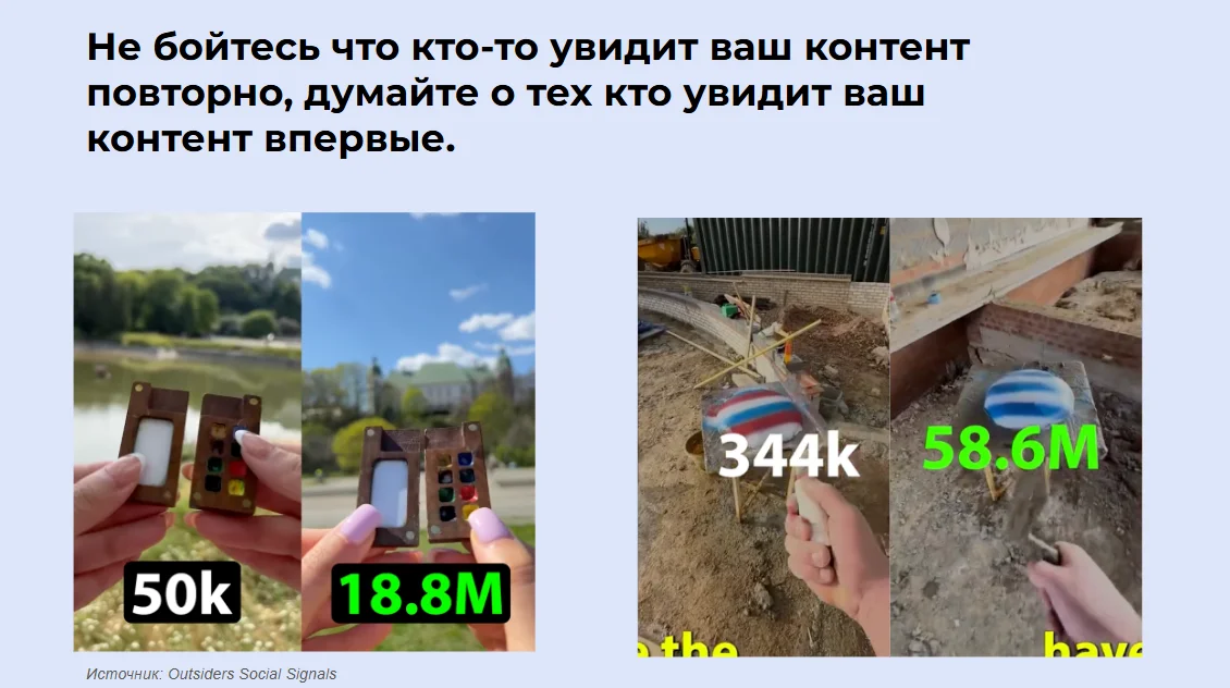 Также не стоит пренебрегать вечнозеленым контентом, который остаётся актуальным долгое время, например, месяцы или годы. И пусть кто-то увидит контент повторно. Заново снятые популярные видео при повторной публикации могут набрать еще больше охвата, и их может увидеть новая аудитория.