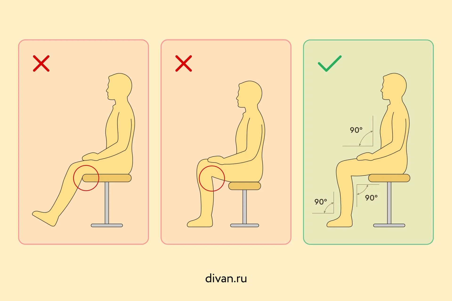 В тазобедренном, коленном и голеностопном суставах должен быть примерно прямой угол. Это оптимальное положение, которое снижает нагрузку на суставы и позволяет долго сидеть без дискомфорта.