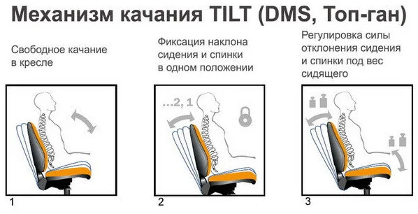 Простой механизм (топ-ган) позволяет только отклонять спинку назад. Более продвинутые (синхронный механизм, мультиблок) позволяют синхронно отклонять спинку и сиденье в правильной пропорции.