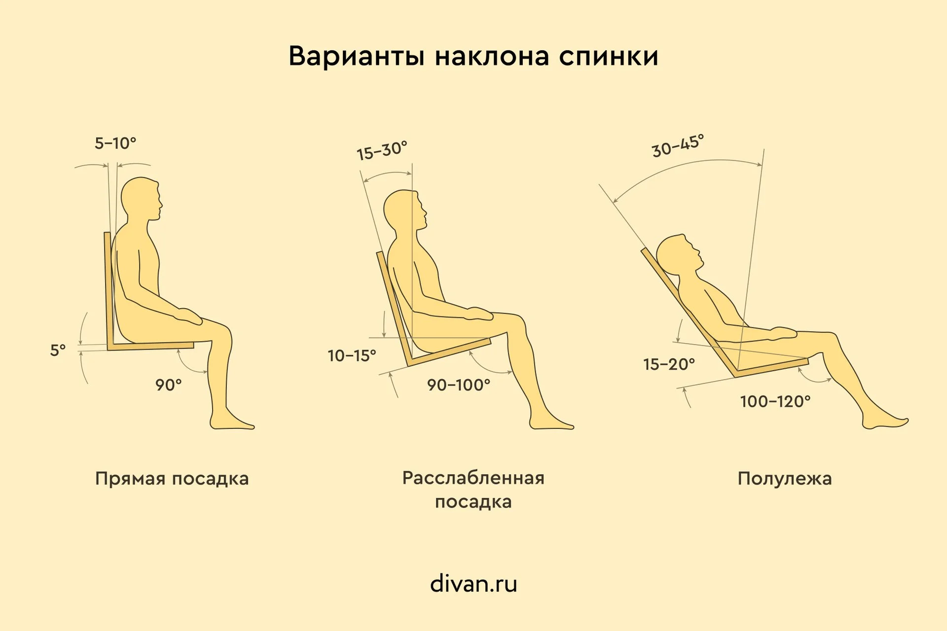 Важно, чтобы спинка регулировалась по углу наклона. Оптимальный угол между спинкой и сиденьем — 95–100 градусов для активной работы и 110–115 для отдыха.