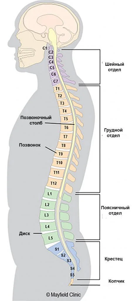 Человеческий позвоночник имеет естественную S-образную форму с тремя основными изгибами: шейным лордозом (изгиб вперед), грудным кифозом (изгиб назад) и поясничным лордозом (изгиб вперед).