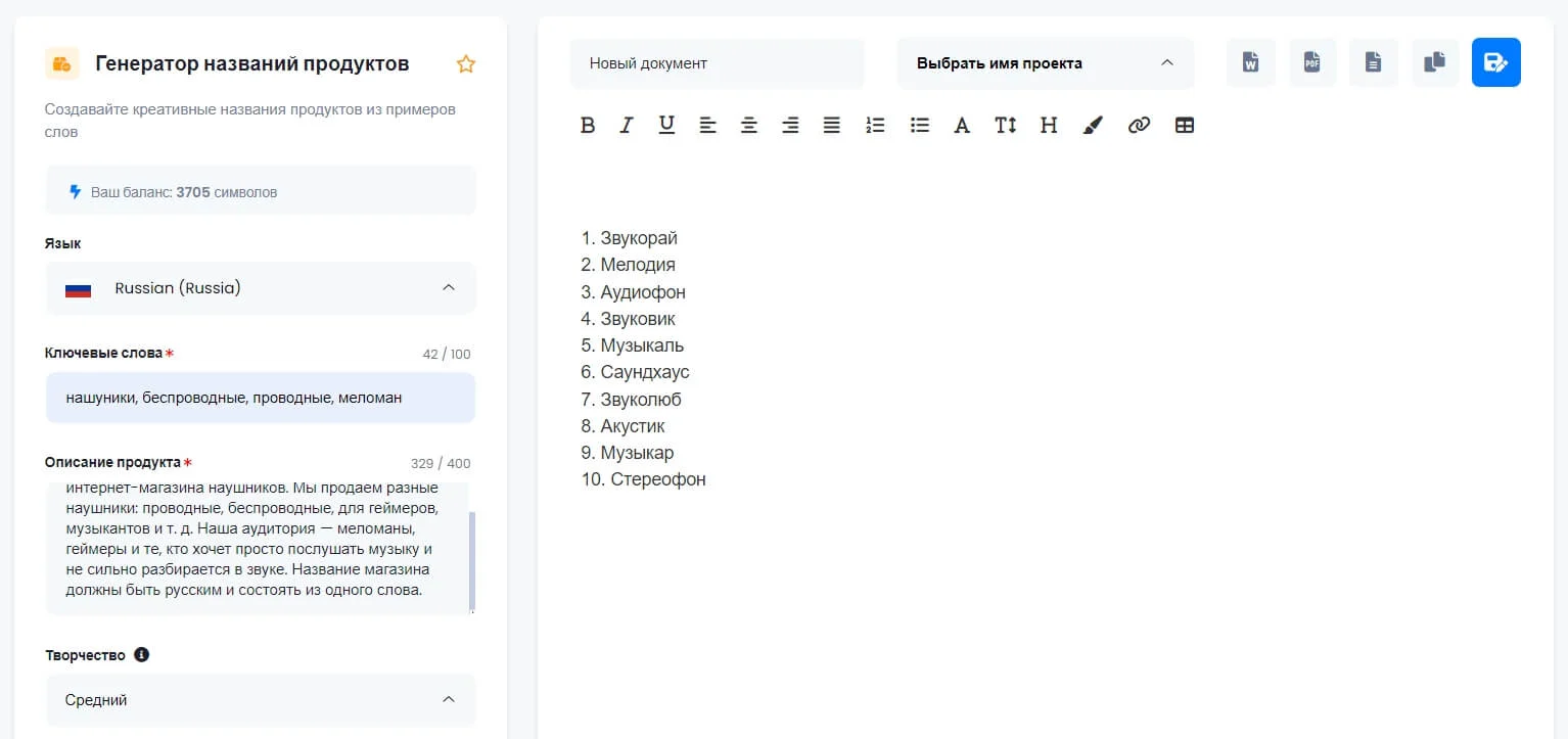 Airuco — это нейросеть с готовыми шаблонами для запросов. Здесь не нужно объяснять, что вы хотите получить от ИИ. Достаточно выбрать раздел «генератор названий продуктов», описать свой продукт и дать несколько ключевых слов. Варианты получаются неплохие.