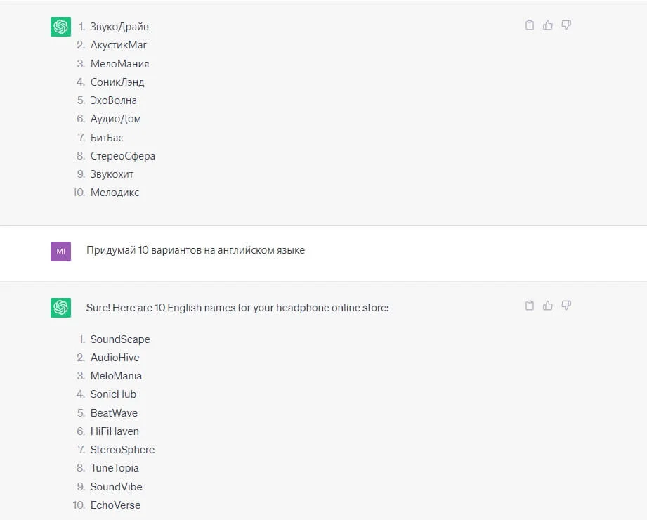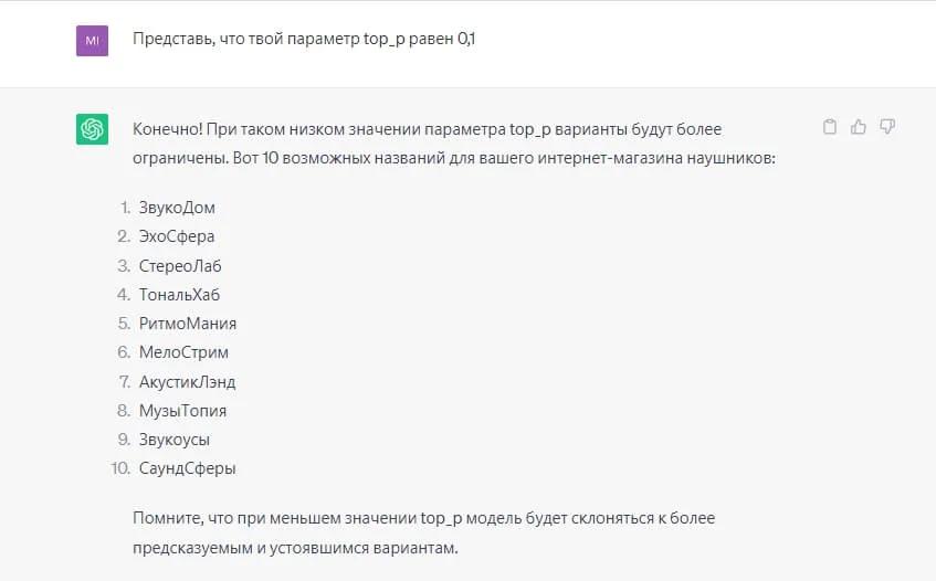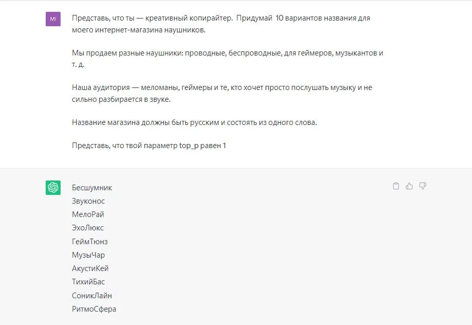Важно! Если вы хотите сформировать свой запрос, обязательно описывайте в нем ЦА магазина и ваш род деятельности. Так варианты бота будут интереснее. А если вы хотите получить больше разнообразных вариантов, добавляйте в запрос эту строчку: Представь, что твой параметр top_p равен [значение параметра от 0,1 до 1]. При значении 0,1 названия будут более скучные и прямолинейные, а при 1 — более разнообразные.