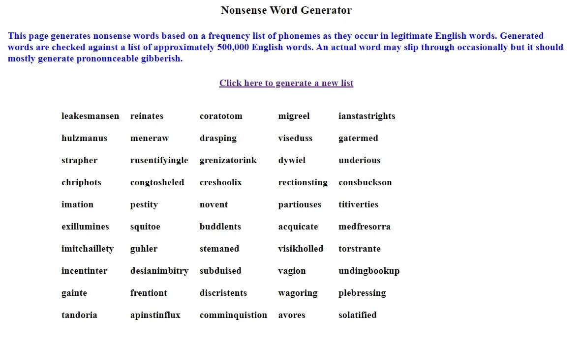 Этот вариант подходит, если у вас нет четкого позиционирования и вы просто хотите придумать красивое слово. Попробовать рандомайзер можно на сайте Soybomb. Настроек здесь никаких нет — просто открываете сайт и получаете 50 вариантов несуществующих слов. Если хотите подобрать новые — кликайте на кнопку «Click here to generate a new list».