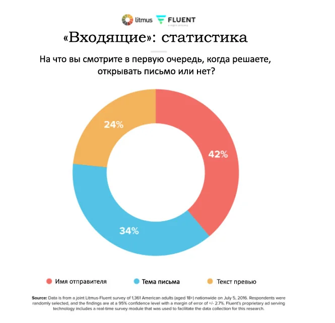 Тема рассылки важна, но содержание письма гораздо важнее. Это подтверждают исследования Litmus: 42% подписчиков в первую очередь обращают внимание на отправителя, когда решают, открывать письмо или нет. Имя отправителя у получателей ассоциируется с качеством рассылки