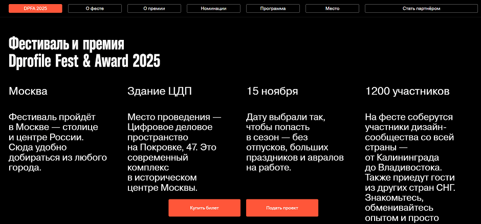 Еще одна особенность DProfile — конкурсы и премии. Площадка регулярно проводит тематические активности, где участники представляют проекты и борются за признание профессионального сообщества. Это еще один эффективный способ продвижения: лауреаты и победители конкурсов получают баллы рейтинга, упоминания на платформе и в медиа, что повышает заметность среди потенциальных клиентов и выделяет на фоне конкурентов.