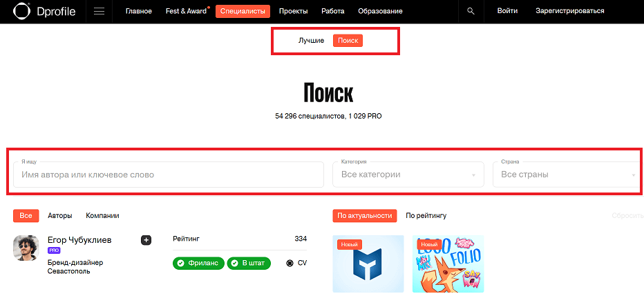 Также в разделе есть страница сортировки профилей: по имени автора или ключевому слову, категориям работ (например, анимации, брендинг, иллюстрации) и геолокации. Благодаря таким фильтрам заказчики могут быстро найти подходящего подрядчика, а специалисты — получить шанс регулярно находить новые проекты.