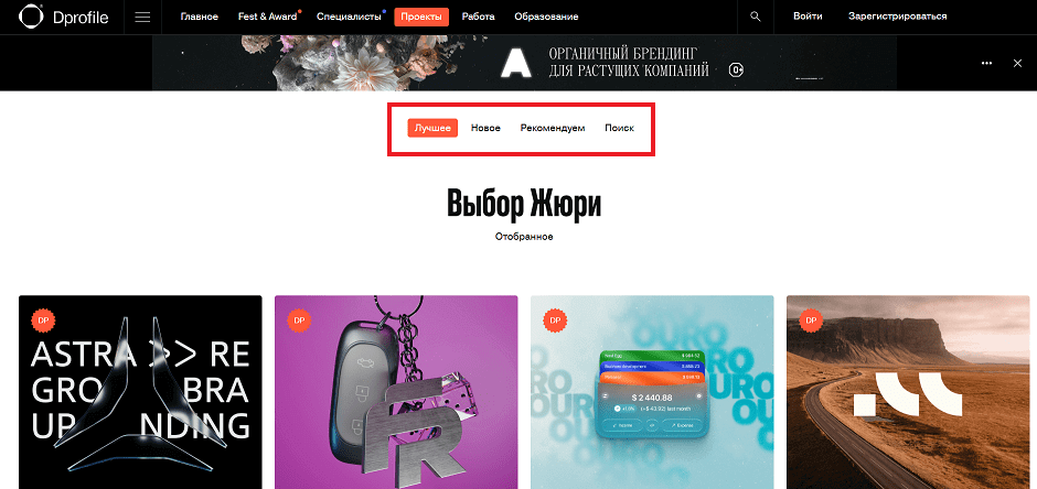 Главная страница DProfile — это витрина актуального контента. Здесь выводятся подборки проектов, анонсы конкурсов и новости площадки. Такой формат позволяет сразу понять, чем живет сообщество, и вдохновиться примерами коллег.
