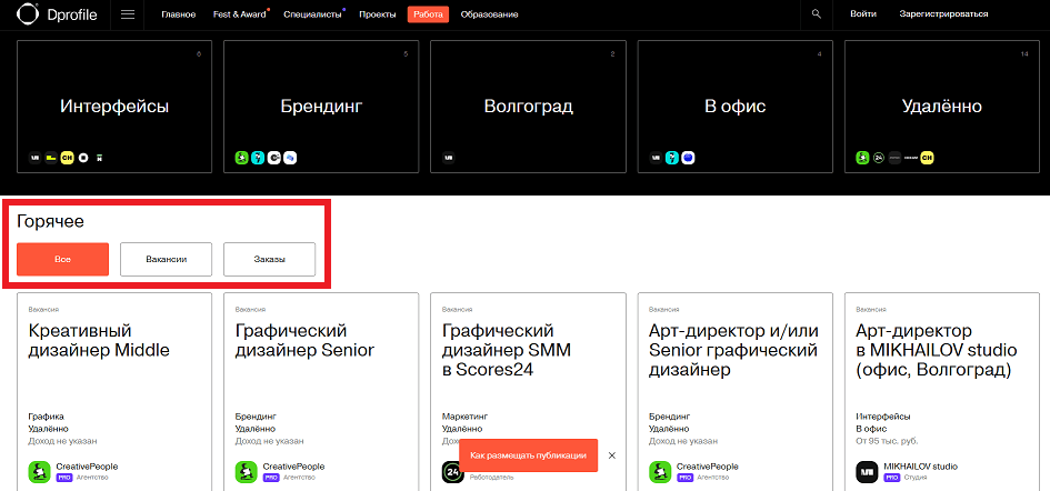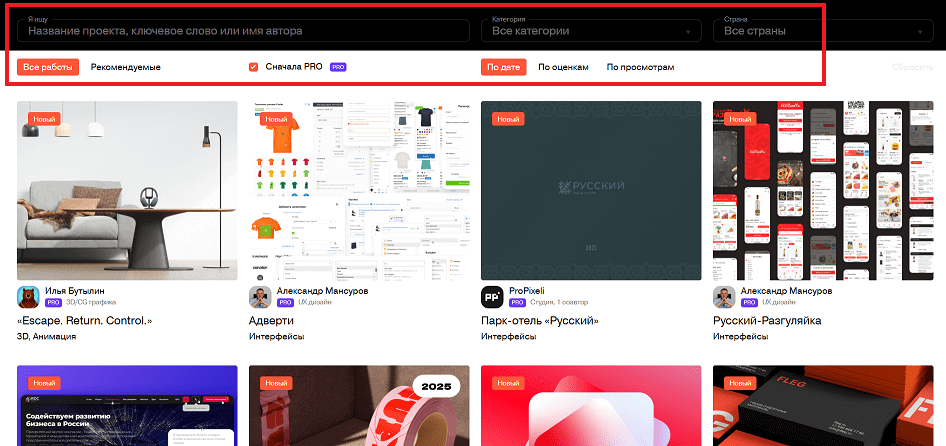 Для новых пользователей это удобная точка входа. По главной легко понять, какие проекты привлекают внимание клиентов и какие специалисты сейчас в тренде. Это поможет сориентироваться в ожиданиях аудитории и подготовить под нее эффектное портфолио.