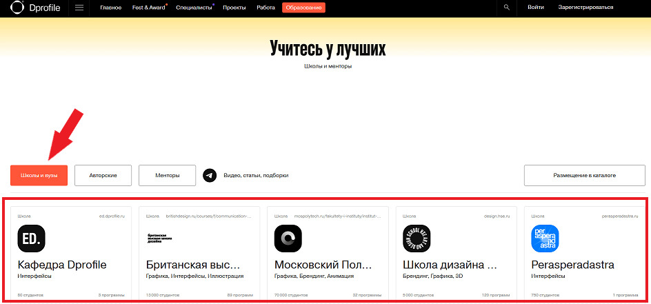 В разделе «Образование» собраны обучающие программы, а также курсы от известных школ, онлайн-университетов и продвинутых пользователей DProfile. С их помощью можно получить фундаментальное образование или новую профессию, подтянуть нужные хард скилы или освоить конкретную специализацию.