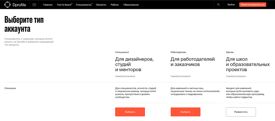 Для частных дизайнеров, студий и агентств больше подходит тип аккаунта «Специалист». С ним вы сможете оформить портфолио и находить клиентов на платформе.