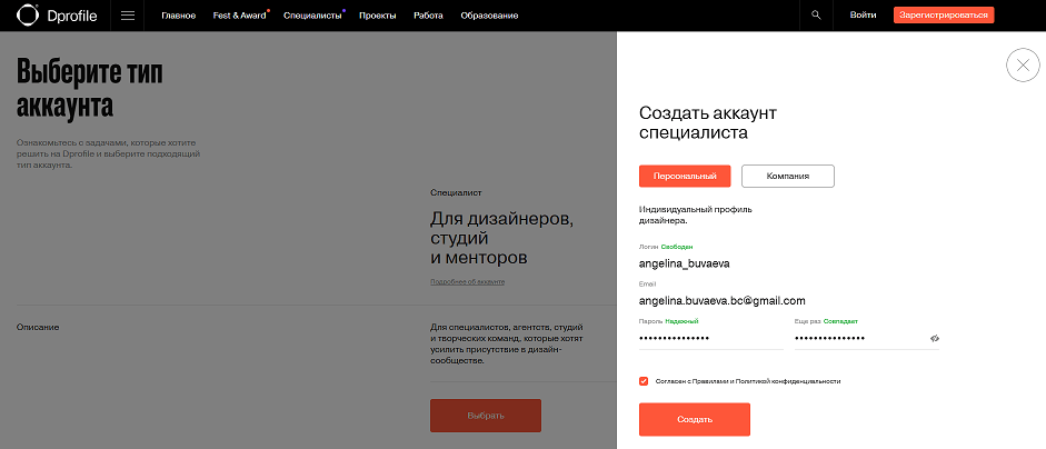 В форме регистрации нужно ввести логин, email и пароль, указать тип профиля: выбирайте «Персональный», если будете продвигать себя как частного специалиста, или «Компания», если хотите продвигаться на площадке как студия или агентство. От типа профиля будет зависеть стоимость платного продвижения, как уже писали выше.