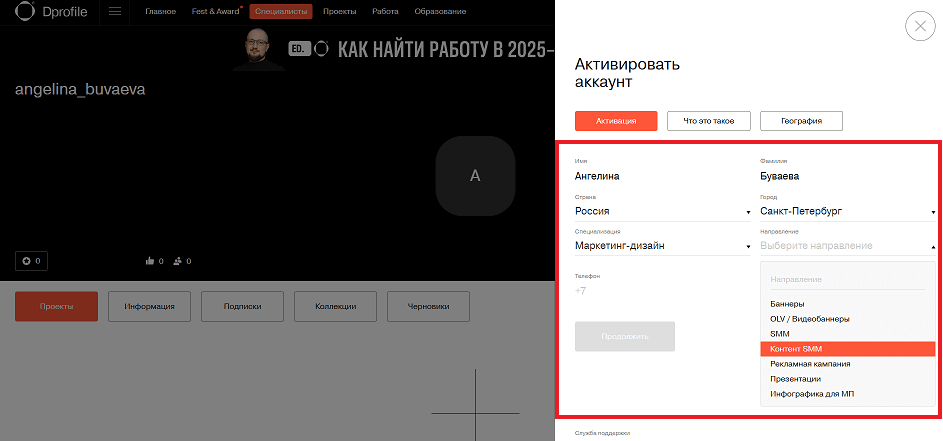 В новой форме укажите имя и фамилию, геолокацию, специализацию и направление, номер телефона. Специализацию и направление можно будет поменять в любой момент в настройках профиля, а если оформите платную подписку, сможете выбрать до трех направлений.