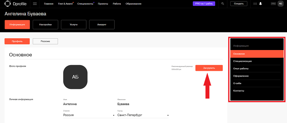 Загрузите аватар через кнопку «Загрузить» — лучше выбрать качественное портретное фото. Затем добавьте информацию в основные блоки в меню справа.