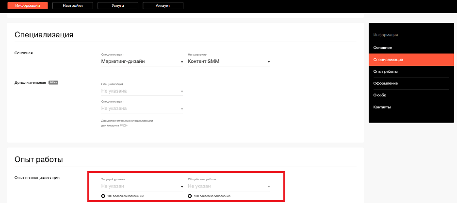 В разделе «Специализация» укажите основное направление деятельности. После оформления Pro или Pro+ можно добавить еще две специализации на выбор.