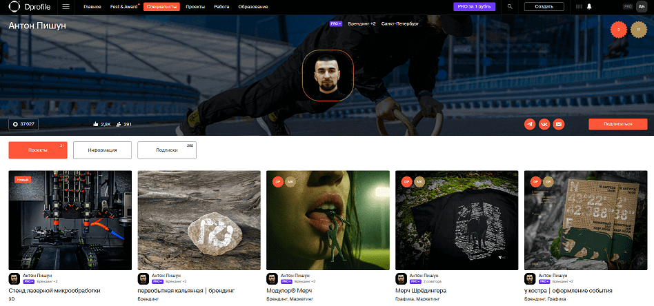 DProfile — это онлайн-площадка для специалистов креативных индустрий. Она появилась несколько лет назад и стала достойной альтернативой нескольким зарубежным сервисам. Сейчас на DProfile успешно продвигаются дизайнеры-фрилансеры, студии дизайна и SMM-специалисты. Причем они не просто размещают портфолио или откликаются на проекты, как на Behance или FL.RU, а используют платформу как полноценный канал для продвижения бренда и услуг.