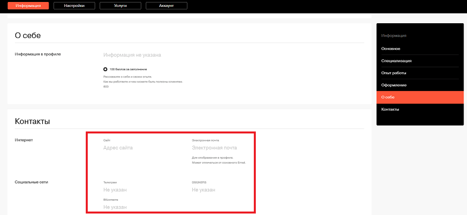 В раздел «О себе» добавьте мини-презентацию, а в «Контактах» укажите ссылки на сайт и соцсети.